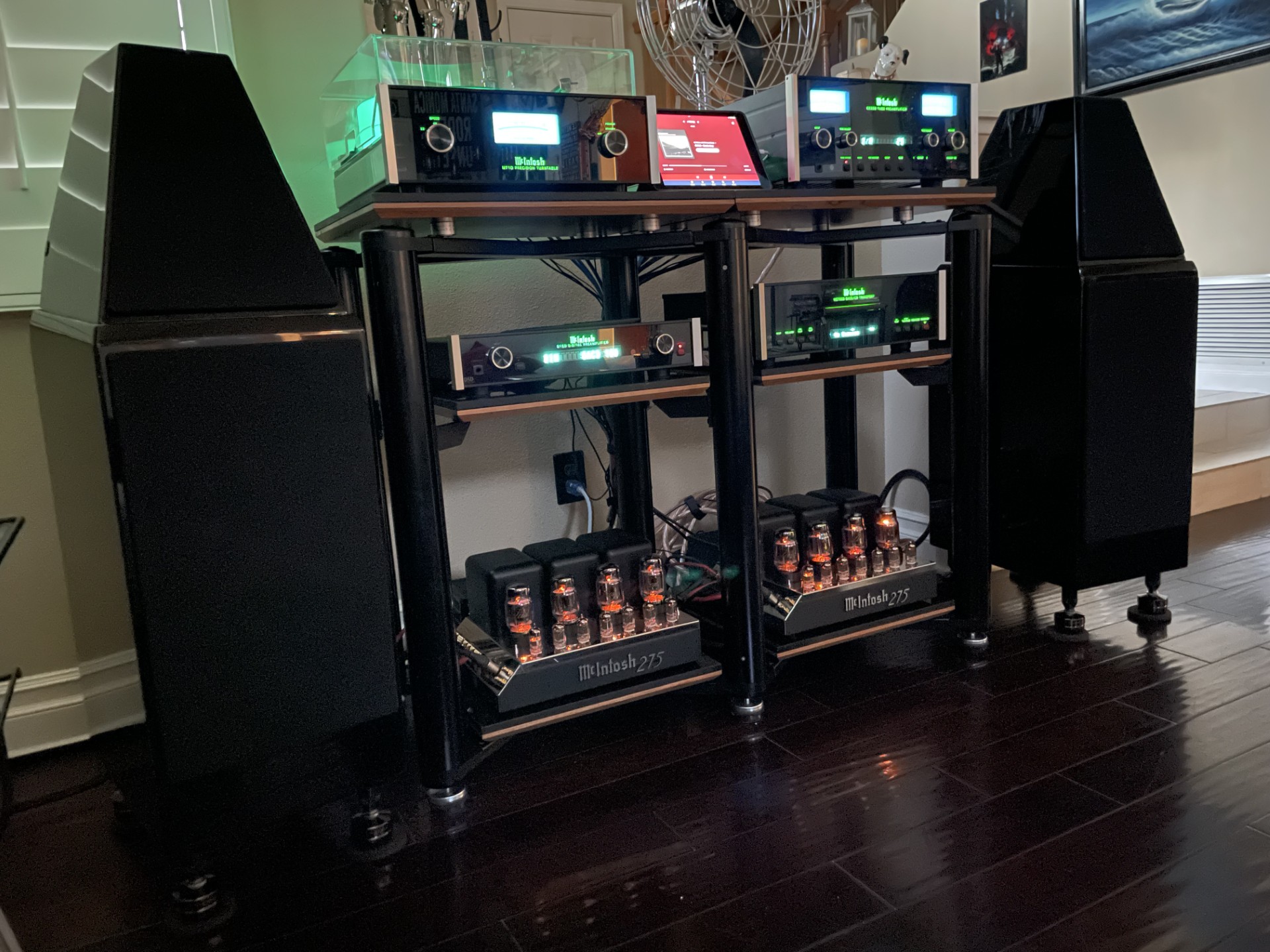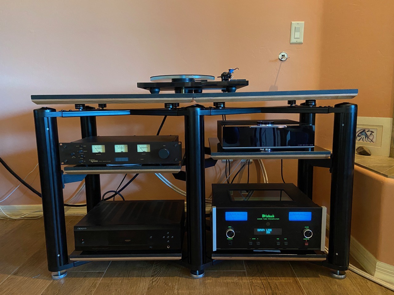 These racks are purpose-built for serious, high-end turntable systems. The top level accommodates either a generously sized 19x24-inch platform or an even larger 21x27-inch platform. Lower levels feature our standard 18x18-inch platforms, which can be upgraded to larger sizes for a small additional charge. All pricing includes platforms trimmed in solid cherry hardwood.
